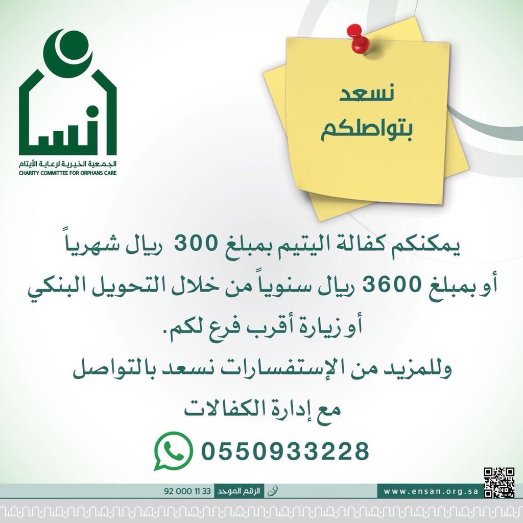 جمعية إنسان Twitterren كفالة اليتيم مبلغ ٣٠٠ ريال عن طريق زيارة احد فروع الجمعية أو تحويل المبلغ لحسابات الجمعية وارسال صورة الحواله على الرقم المرفق بلغكم الله الأجر الموعود بصحبة خير