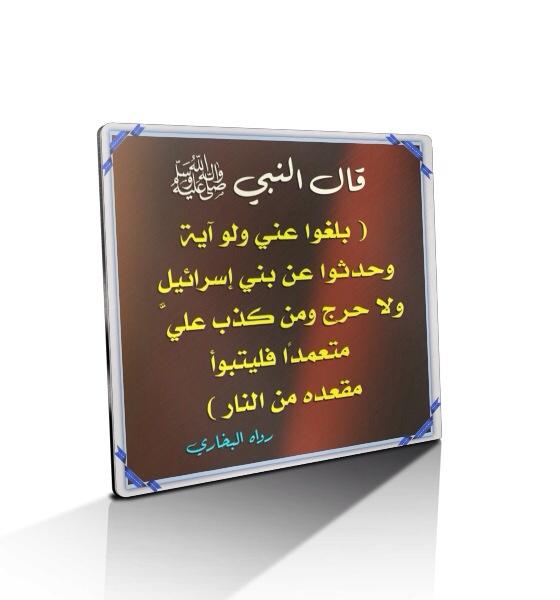 حديث بلغوا عني ولو آية وحدثوا عن. بل غوا عني ولو آية وحدثوا عن بني إسرائيل ولا حرج وم ن كذب علي متعمد ا فليتبو أ مقعده من النار. قال رسول الله صل ى الله عليه وسل م. ب ل غ وا ع ن ي ولو آي ة و ح د ث وا عن ب ن ي إ س ر ائ يل و ل ا ح ر ج و م ن ك ذ ب ع ل ي م ت ع م د ا ف ل ي ت ب و أ م ق ع د ه م ن الن ار. رواه البخاري في أحاديث الأنبياء 3461.