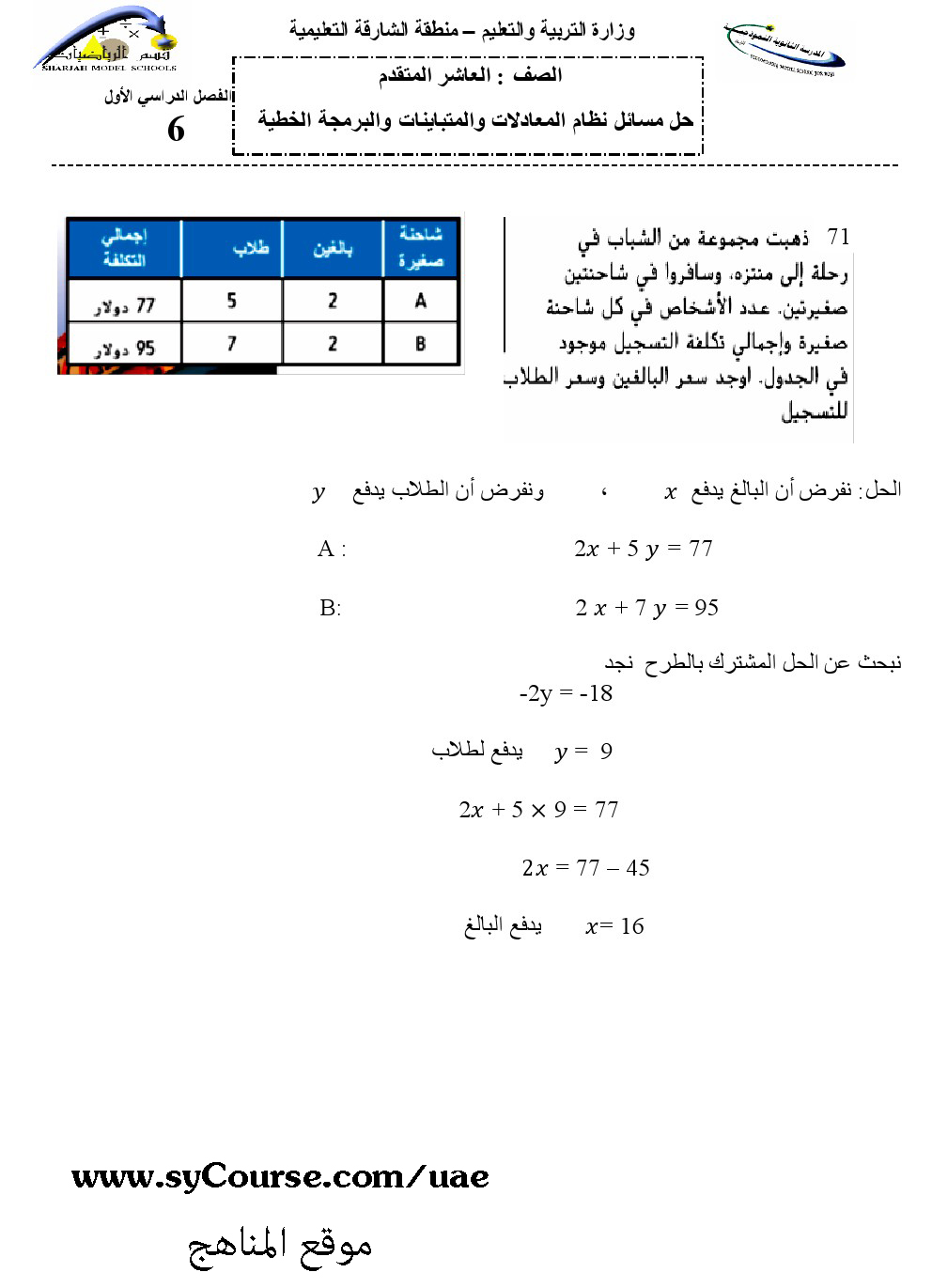 حل مسائل نظام المعادلات والمتباينات والبرمجة الخطية 2016 2017 الصف العاشر المتقدم رياضيات الفصل الأول المناهج الإماراتية