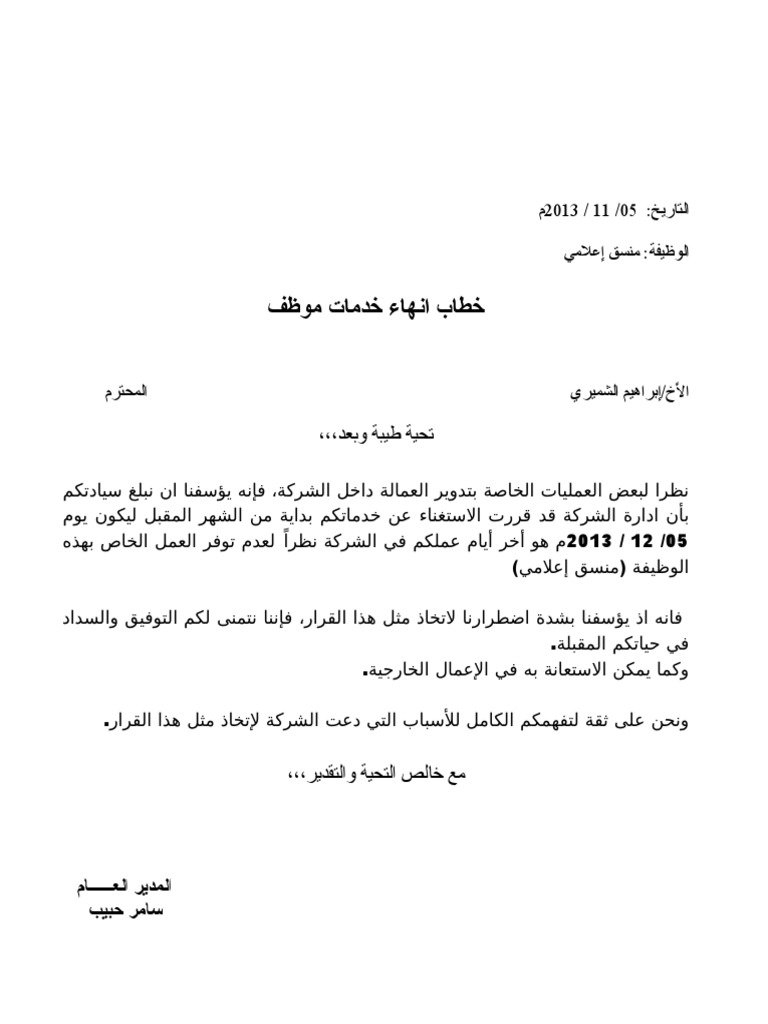 Na0061العربية خطاب إنهاء الخدمة لتغير ظروف وإحتياجات العمل Namozaj